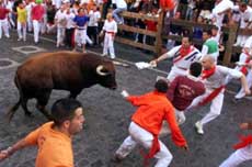 圖:西班牙奔牛節造成多人受傷 2002年07月08日 19:59 ![]() 7月6日,一年一度的奔牛節在西班牙潘普洛納市拉開帷幕;顒赢斕欤陀袛等嗽诙放?癖歼^程中被牛角刮傷。據稱,今年的奔牛節是近年來最危險的一次。圖為奔跑的人們引領著瘋狂的公牛。(春風)