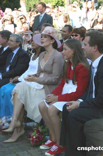丹麥王國的馬麗王儲妃3日出席紀念丹麥著名童話作家安徒生誕辰200周年游行活動。圖為王儲妃(戴帽者)手持參加“中國西藏文化周”活動的藏族藝術家在參加游行活動中獻上的哈達,并觀看藏族歌舞表演。