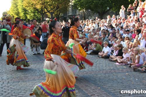 參加“中國西藏文化周”的藏族演員也出現在游行的隊伍中。圖為藏族演員表演的歌舞吸引了沿途觀看的丹麥觀眾。