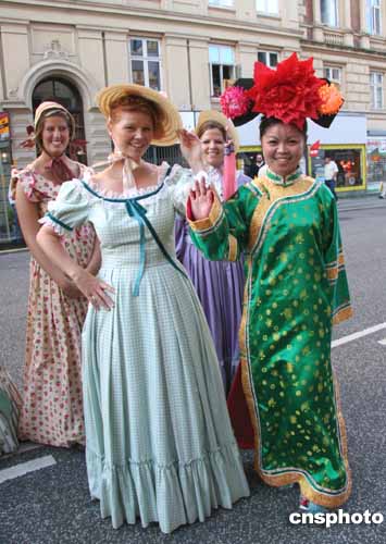 由中國留學生為主組成的中國方陣演繹的是安徒生名作《夜鶯》。圖為身穿清朝服飾扮演皇妃的中國女留學生與丹麥古代淑女的扮演者在游行中合影。