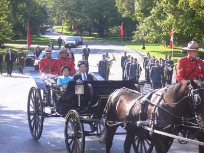 當?shù)貢r間九月八日下午,加拿大總督克拉克森在總督府舉行盛大儀式,歡迎中國國家主席胡錦濤對加拿大進行國事訪問。圖為胡錦濤夫婦乘坐敞篷馬車抵達加拿大總督府出席克拉克森總督舉行的盛大歡迎儀式。中新社記者呂振亞攝