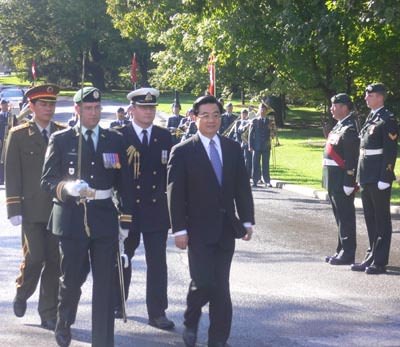 加拿大總督克拉克森在總督府舉行盛大儀式,歡迎中國國家主席胡錦濤對加拿大進行國事訪問。圖為胡錦濤主席檢閱儀仗隊。中新社記者呂振亞攝