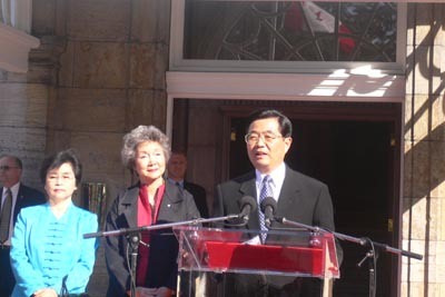 加拿大總督克拉克森在總督府舉行盛大儀式,歡迎中國國家主席胡錦濤對加拿大進行國事訪問。圖為胡錦濤在歡迎儀式上發(fā)表講話。中新社記者呂振亞攝