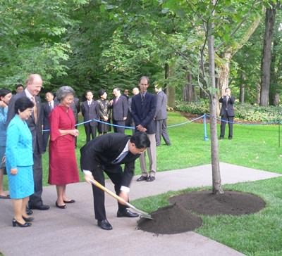 加拿大總督克拉克森在總督府舉行盛大儀式,歡迎中國國家主席胡錦濤對加拿大進行國事訪問。圖為胡錦濤與克拉克森會見后,在總督府庭院內(nèi)種植中加友好紀念樹。中新社記者呂振亞攝
