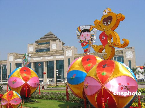 | 十月十一日,距離第二屆中國—東盟博覽會(huì)、二○○五南寧國際民歌藝術(shù)節(jié)開幕還有八天。東道主廣西壯族自治區(qū)首府南寧市已顯出濃濃的節(jié)日氣氛,街頭廣場上出現(xiàn)了壯族的吉祥物繡球造型以及博覽會(huì)和民歌節(jié)的吉祥物“合合”和“歌娃娃”造型。作者:劉萬強(qiáng)