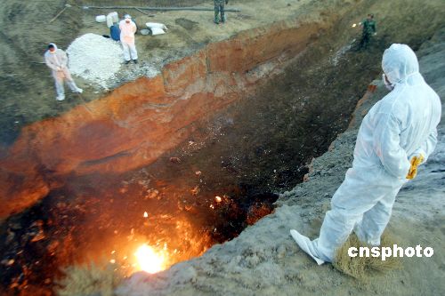 | 十一月十六日,新疆烏魯木齊縣安寧渠鎮的防疫人員在深約五米的掩埋坑內集中焚燒收集來的家禽。目前,新疆兩地疫區已在三公里范圍內撲殺家禽三十二點二五萬只。據中國農業部公布,新疆澤普縣、烏魯木齊縣兩地發生高致病性疫情。疫情發生后,當地政府及時啟動有關應急預案,在疫區各交通路口設立臨時動物簡易消毒站,禁止疫區禽類產品運出,并撲殺疫區內所用禽類,進行無害化處理,關閉疫區周圍十公里范圍內的所有禽類及其產品交易市場。作者:姚剛(通訊員)