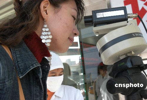 | 十一月二十二日上午,一名北京女青年前往北京佑安醫(yī)院進入門診樓時,在安置在云臺上的紅外線測溫儀前測試體溫,以防止意外流感造成疾病傳播。佑安醫(yī)院是《北京市人間禽流感突發(fā)疫情應(yīng)急預(yù)案》中確定的“北京市四家定點收治人間禽流感病人的醫(yī)院”之一。佑安醫(yī)院已成立一支由四十名一線醫(yī)護人員組成的醫(yī)療應(yīng)急救治隊伍,目前每周都開展一次“模擬”收治人禽流感病例的應(yīng)急演練。作者:鄒憲