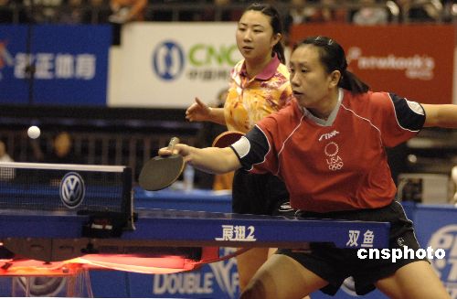 | 2005年國(guó)際乒聯(lián)巡回賽總決賽十一號(hào)在中國(guó)福州繼續(xù)進(jìn)行,在晚上進(jìn)行的女雙決賽中,來(lái)自美國(guó)和西班牙的跨國(guó)組合高軍/沈雁飛以四比一擊敗韓國(guó)選手金福來(lái)/金景娥奪得女雙冠軍. 作者:王東明
