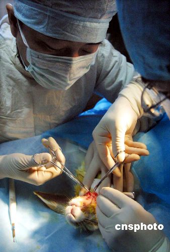 | 12月23日,西安西京醫(yī)院全軍整形外科研究所向媒體展示他們?nèi)陙硌芯拷Y晶——成功地為一只小灰兔實施“換臉術”,使其成為呈現(xiàn)灰白兩色臉龐的小兔子。據(jù)悉,這只兔子在14天以前被實施換臉術,將一只白兔的半只臉移植到這只灰兔臉上,目前灰兔生命體征正常,眼睛可以閉合。隨后,三名醫(yī)生為另一只灰色的兔子再次實施換臉手術。據(jù)了解,這是中國首次報道成功的動物換臉術,不久前法國實施了全球首例人換臉術。作者:欒東