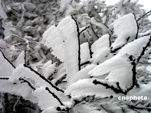 | 2006年1月21日-22日,南京紫金山上出現(xiàn)罕見霧凇。1月19日的一場大雪,加上大風(fēng)、大霧、低溫,使山頂上的樹枝上凝結(jié)成了一種奇特景觀--霧凇順著一個(gè)方向猶如凝結(jié)住的一面面水晶瓢動的旗,長的居然有2-30cm,令人稱奇。霧凇又稱“樹掛”,是霧氣和水汽遇冷凝結(jié)在枝葉上的冰晶。作者:維勇