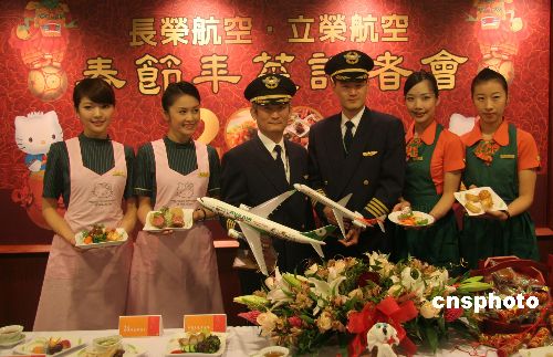 | 臺灣長榮航空積極籌備兩岸春節(jié)包機各項準備工作,并將特別調(diào)派全球首架“Hello Kitty”彩繪機飛航一月二十七日臺北—北京航班。圖為長榮及其控股的立榮航空公司在此間共同舉辦春節(jié)包機記者會,展示“Hello Kitty”機模型和具有中國傳統(tǒng)習俗的餐飲。作者:曾嘉