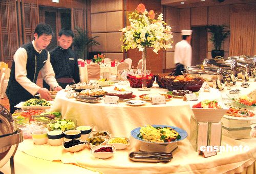 | 2006年1月25日,據(jù)商務(wù)部預(yù)測:2006年中國餐飲業(yè)零售額有望突破一萬億元。2005年中國餐飲業(yè)零售額實(shí)現(xiàn)8806億元,同比增長16.8%,連續(xù)15年實(shí)現(xiàn)兩位數(shù)高速增長,對社會(huì)消費(fèi)品零售總額的增長貢獻(xiàn)率約為18%。圖為寧波一飯店自助餐廳正在做就餐準(zhǔn)備。作者:張和平