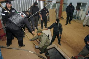 墨西哥警察看守在通道中查獲的毒品。 墨西哥士兵爬出地道。