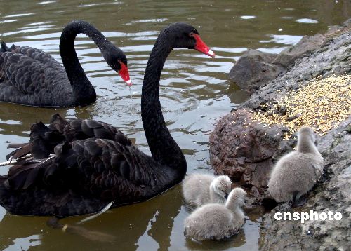 | 2月5日,3只“丑小鴨”隨著黑天鵝父母覓食。入春以來,重慶野生動物世界天鵝湖里多了3只幼雛黑天鵝,它們跟在黑天鵝父母身邊,時而覓食,時而嬉戲。黑天鵝是觀賞鳥類珍貴品種,體重5-8公斤,全身羽毛深黑,嘴為深紅色,頭頸約占全身總長的一半,翅上長有如風帆一般卷曲的婚羽,極為美麗。幼雛1-3天后可隨親鳥下水活動,在親鳥帶領下覓食,不過它們還是穿著一件灰色外套,就是人們常說的“丑小鴨”。“丑小鴨”絨毛換成羽毛的順序為頭——翅——全身。最初的絨毛呈淺灰色,以后換成灰黑色,顏色逐漸變黑,嘴變紅且尖端可見白斑,最后變成成年黑天鵝一樣的黑色。作者:陳仕川