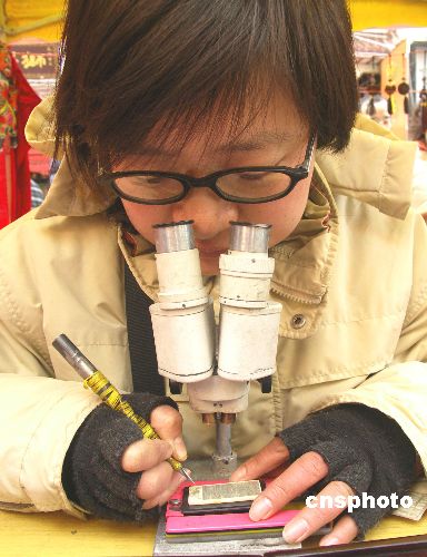 | 2月3日,微雕藝術家羅蘭在高倍放大鏡下進行雕刻。春節期間,我國唯一的一位女微雕藝術家、江蘇省民間文藝協會會員羅蘭,在南京湖南路民俗文化廟會為各地游客進行工藝品微雕受到歡迎。羅蘭自10歲開始從父學習微雕藝術已刀筆30年。其獨樹一格的作品構圖新穎、線條流暢、古樸蒼勁。主要作品有《清明上河圖》、《孫子兵法》、《百子圖》、《十虎圖》、《大悲咒組觀音像》等。其中她在12厘米長,0.5厘米寬的象牙上雕刻的777位人物,100多間房屋,90多種動物、20多條船只及城樓、橋梁、樹木等景物的《清明上河圖》,將真跡濃縮了2300倍,作品享譽中外、斐聲藝壇。她創作的珍珠微雕肖像在微雕界也是首掘一指。 作者:谷昌旺