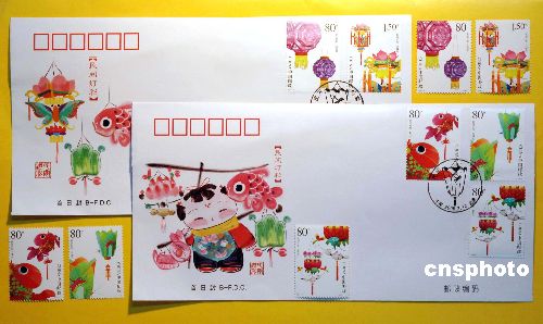 | 農歷正月十五元宵節即將來臨之際,北京市郵票公司為配合中國國家郵政局于二零零六年二月十二日發行《民間燈彩》特種郵票一套五枚,特設計印制了該郵票的首日封、郵折等郵品,并與郵票同日發行。這五枚郵票分別是:魚燈、白菜燈、蓮花燈、龍風燈、花蝶燈,面值分別為八十分、八十分、八十分、一元五角。中國民間有張燈結彩的習俗。“燈彩”又稱“花燈”,主要分為京制、滬制、蘇制、粵制和浙制;其制作技法繁多,但寓意均為吉祥的祝福。作者:鄒憲