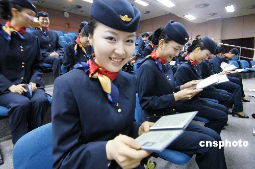 | 中國南方航空公司新招收的三十名韓國籍乘務(wù)員正在喜看培訓(xùn)考核證書。這批韓籍空姐二00五年十二月二十七日在廣州南航乘務(wù)培訓(xùn)中心開始接受客艙服務(wù)、空中醫(yī)學(xué)、機型知識等理論和實際操作的培訓(xùn)、考核,二00六年二月二十七日結(jié)束培訓(xùn),已經(jīng)全部通過嚴(yán)格的考核,即將由帶飛老師帶領(lǐng)上機實習(xí),帶飛合格后將在韓國首都首爾駐勤飛行。作者:林宇定