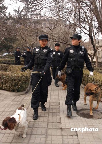 | 北京一隊(duì)警員動(dòng)用警犬檢查“兩會(huì)”場所。自2月28日以來,擔(dān)負(fù)全國“兩會(huì)”代表委員住地、場所防爆安全檢查任務(wù)的北京警方刑偵總隊(duì)警犬偵查訓(xùn)練大隊(duì),動(dòng)用20條警犬對從3月3日起陸續(xù)開幕的全國人大、政協(xié)“兩會(huì)”會(huì)場、住地、車輛等進(jìn)行全面細(xì)致的防爆安全檢查。作者:吳振英