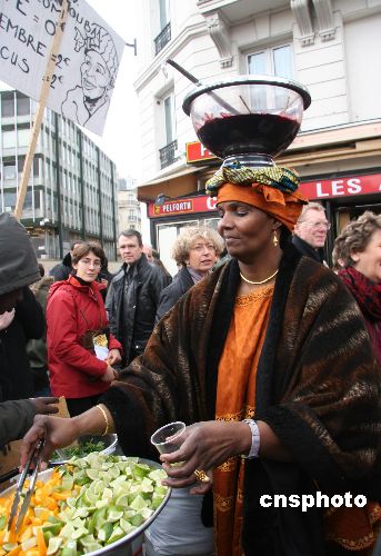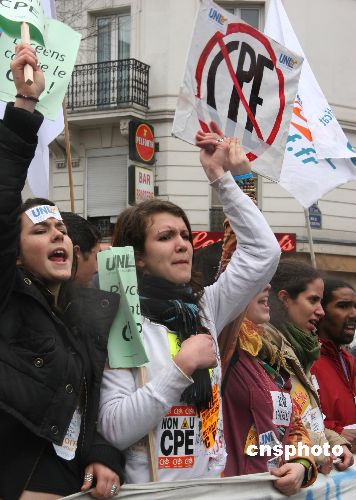 | 當地時間3月28日,學生在巴黎街頭高舉標語呼吁撤消“首次雇用合同”的口號(上圖)。醞釀已久的巴黎28日大游行如期舉行,來自大中學校的學生和工會組織為反對“首次雇用合同”走上街頭。事先組織者宣傳游行人數將達一百萬,而當日工會公布的數字是七十萬,但警方則說只有九萬多。下圖為一個巧借游行主題的婦人在游行途經街邊賣水。她頭頂一個盆,旁邊立有一塊標語牌,上寫“CPE(首次雇用合同)”:0歐元,姜水:2歐元。此舉贏得不少游行者照顧她的生意。作者:鐘誠