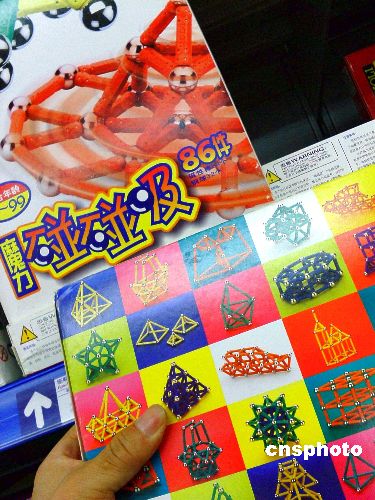 | 一款在中國與美國均有出售的磁性積木玩具,成為兒童的奪命陷阱。推出該玩具的加拿大玩具商MegaBlok日前下令召回380萬份從中國進(jìn)口的玩具,Magnetix磁性積木是益智類玩具,2003年9月上市后風(fēng)靡全美。據(jù)悉,該玩具在美國共發(fā)生34宗意外。據(jù)了解,上海一些兒童玩具銷售場所,發(fā)現(xiàn)都有類似的磁石拼裝玩具銷售。作者:井韋