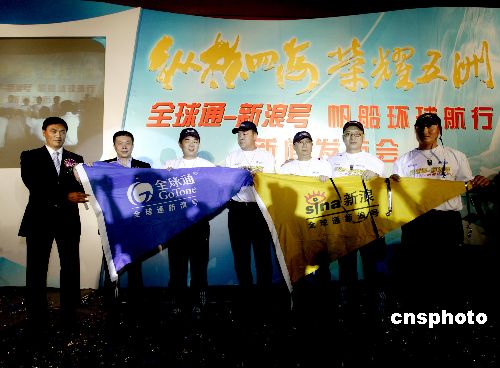 | 五月十六日,主題為“縱橫四海,華耀五州”的“全球通·新浪號”環球航行啟航發布會在北京舉行。五月二十四日,由中國移動和新浪共同發起、旨在“傳播中國文化,收集奧運祝!钡姆h球航行將在法國啟航,再續二十一世紀中國人的航海傳奇。航行預計歷時六至八個月,帆船將從法國開始西行,經大西洋、穿過巴拿馬運河、橫跨太平洋,最后經由南中國海抵達中國深圳市,總航程一點八萬海里。圖為新浪首席執行官兼總裁曹國偉(左二)和中國移動通信集團公司市場部總經理徐達向“全球通·新浪號”船員授旗。作者:李剛