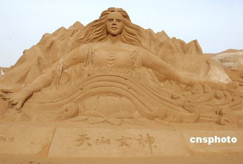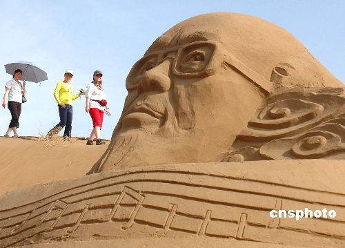 | 5月20日,在新疆吐魯番庫木塔格沙漠風景區(qū)的“中國沙雕藝術城”,幾名游客從剛制作好的王洛賓沙雕像旁走過。近日,新疆吐魯番庫木塔格沙漠風景區(qū)的“中國沙雕藝術城”新制作的24組反映新疆歷史文化、民風民俗的沙雕作品相繼完成,并向游人開放。據(jù)了解,這些沙雕作品是為6月在吐魯番舉辦的第三屆新疆國際旅游節(jié)暨第十五屆中國絲綢之路吐魯番葡萄節(jié)制作的。中新社發(fā) 劉健 攝