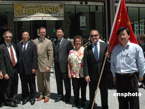 | 美國當地時間六月五日中午,二十五個國家的五百多名嘉賓聚集在芝加哥市的戴利廣場, 熱烈慶祝美國國際姐妹城市項目開展五十周年,同時, 為期一周的芝加哥國際姐妹城市節(jié)也于當天揭開帷幕。美國國際姐妹城市項目始于1956年;1985年, 芝加哥先后與中國上海市和沈陽市結成了姐妹城市。圖為芝加哥國際姐妹城市項目主席羅伯特·卡爾(左三)、項目中國委員會主席威廉·斯潘賽(左一)和正在芝加哥訪問的沈陽市對外經濟貿易局負責人錢乃生(左二)、關志鵬(右四)、芝加哥廣州協(xié)會會長胡大江(右一)等在開幕式上合影。中新社發(fā) 張大衛(wèi) 攝