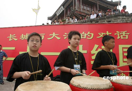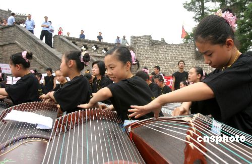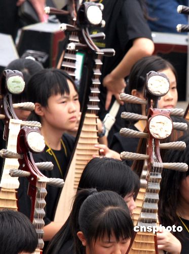 | 6月19日上午,在萬里長城唯一同大海相匯的地方--河北秦皇島老龍頭萬里長城入海處,300多人用中華民族獨特的民樂合奏一曲《長城謠》,不僅讓萬里長城首次諦聽了游子與華夏兒女的心音。也使中華民族音樂的魅力首次得以在長城上全面展現(xiàn)。當(dāng)日上午,于6月17日開幕的二十一世紀國際華樂節(jié)在秦皇島開幕,參加國際華樂節(jié)的210名新加坡、馬拉西亞的華樂演奏人員與國內(nèi)各音樂學(xué)院、民間樂團、音樂協(xié)會等近100名音樂家和演奏員通過在秦皇島古老的老龍頭長城上合奏《長城謠》,把主題為“長城與大海的對話”國際華樂節(jié)活動推向了高潮。中新社發(fā) 劉學(xué)忠 攝