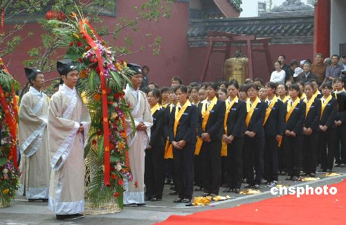 | 九月二十八日上午,鄭州市政府在新修復(fù)的鄭州文廟恢復(fù)舉行傳統(tǒng)祭孔大典,主祭者統(tǒng)一身著漢服,采用三獻(xiàn)禮的傳統(tǒng)祭祀方式,將中原傳統(tǒng)漢文化與祭孔儀式相結(jié)合。中新社發(fā) 胡珂 攝