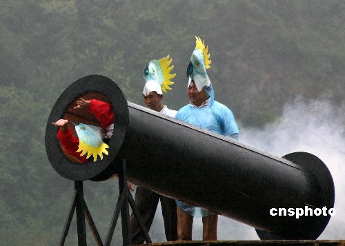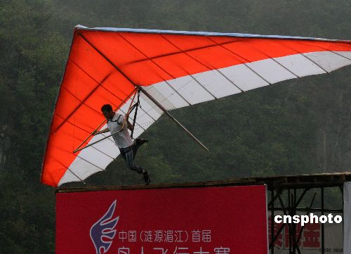 | 10月7日,2006“十一”黃金周湖南最具吸引力的旅游大典,休閑體育運動大賽--中國首屆“鳥人”飛行大賽在湖南省漣源市湄江風景區塞海湖上冒雨進行決戰。該項賽事由漣源市湄江風景區管理處和湖南經視都市頻道聯袂舉辦。來自全國25支隊伍(有4支是來自國外,其中2支來自非洲的盧旺達和加納,另外2支分別來自韓國和印尼。)50多名運動員參賽。“鳥人”運動的起源地歐洲和非洲各有一支隊伍參賽,中國著名的“鳥人”飛行運動大師衣瑞龍將率一支飛行團隊參加了比賽。中新社發 郭國權 攝