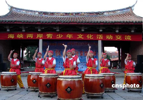 | 7月2日,臺北縣新莊市鼓藝團的小鼓手們在福建泉州表演《節令鼓》。在雄渾深沉的鼓聲的鼓聲中,“中華鼓韻”海峽兩岸青少年文化交流音樂會當日在泉州文廟舉行,來自臺北的新莊鼓藝團、金門開王宣小學及泉州市藝術學校的青少年們分別表演了各自拿手的鼓藝、南音、梨園劇等節目。新莊鼓藝團團長蔡文儒介紹,這是他們第一次到祖國大陸表演,兩岸同胞都是炎黃子孫,表演的節目本著同根同種的原則,挑選了中國24節氣的“節令鼓”等。中新社發 傅丹丹 攝