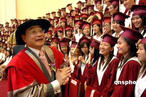 | 七月二十九日,北京中加學校高中及IHM專業學生畢業典禮在北京人民大會堂舉行。來自北京市政府、北京市教委、加拿大駐華大使館、加拿大紐賓士域省教育部等中外嘉賓、畢業生家長及社會各界人士一千四百余人出席了典禮。 今年北京中加學校的高中畢業生共有三百四十九名,其中有三百二十二名同學申請了加拿大的大學,并全部被加拿大三十五個大學錄取。圖為中加學校董事長彭建華博士在畢業典禮上與學生們愉快交談。中新社發 毛建軍 攝