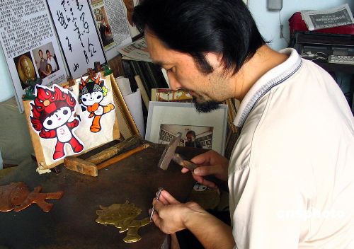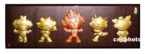 | 8月8日,是2008北京奧運會倒記時兩周年紀念日,河南省工藝美術大師、洛陽鍛銅浮雕肖像工作室的王書品和其子王玄鑒父子二人創作了一套奧運吉祥物——福娃,以此來慶祝奧運,這套福娃長90厘米,寬30厘米,畫面中的福娃是用紫銅板和黃銅板兩種材料,經手工一點一點的鍛打出來的,據王書品介紹,創作這套福娃,父子二人用了八天的時間,于8月7天創作完工,他打算,屆時將這套鍛銅福娃捐贈給北京奧組委,以表達他們對奧運的支持。中新社發 鞏衛東 攝