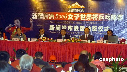 | 2006年9月28日,世界乒壇三大頂尖賽事之一的2006女子世界杯乒乓球賽在烏魯木齊市舉行抽簽儀式。抽簽結果顯示:A組有張怡寧、高軍(美國)、福原愛(日本)、奧斯曼(埃及);B組有郭焱、林菱、帕夫洛維奇(白俄羅斯)、桑托斯·麗嘉·希爾瓦(巴西);C組有帖雅娜、李佳薇(新加坡)、施特魯澤(德國)、王晨(美國);D組有李曉霞、金璟娥(韓國)、劉佳(奧地利)、李凱倫(新西蘭)。比賽將于29日在新疆體育中心開戰(zhàn)。中新社發(fā) 吳峻 攝