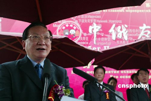 | 國務委員唐家璇7月25日在北京出席“中俄友誼之旅”跨境采訪活動出征儀式,并發表講話。唐家璇表示,“中俄友誼之旅”跨境采訪活動是弘揚中俄偉大友誼的“長征”。中俄友誼之旅”作為2006年中國“俄羅斯年”活動的重要組成部分,由新華社、中國新聞社、中央電視臺等多家媒體40余名記者組成的聯合采訪報道團,將從北京出發經滿洲里口岸進入俄羅斯境內,橫跨歐亞大陸,途經俄羅斯的近20個城市,長途跋涉1.5萬公里,最終抵達莫斯科。中俄兩國媒體共同開展如此大規模的聯合采訪報道活動,這在中俄兩國新聞界的合作史上尚屬首次。中新社發 杜洋 攝