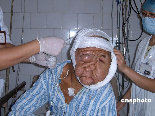 | 被稱為中國“象人”的廣西平樂人歐貴峰六月二十九日首次手術取得初步成功。二零零五年五月,旅美畫家高建武了解到被稱為中國“象人”的廣西平樂人歐貴峰腫瘤掛滿臉部,右眼幾乎失明,頭骨也被病變吸收造成缺損,面部五官嚴重畸形,右足拇指內翻畸形,走路一瘸一拐的慘狀后,決心要幫助他解除病痛。經過高建武一年多的籌備,海外華人捐款達到一萬六千多美元,并聯系到美國舊金山美容整形醫師程光明主刀,二零零六年六月二十九日在桂林市人民醫院為歐貴峰做了首次手術,手術已取得初步成功。 中新社發 彭群 攝