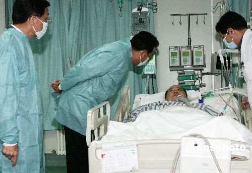 | 九月二十五日,國臺辦主任陳云林前往北京中日友好醫院,看望了在那里接受治療的臺胞顏文雄及其親屬,并聽取了院方的最新救治進展。九月十一日,臺灣一旅游團在吉林省汪清縣境內發生車禍,兩位臺胞和一位大陸司機在此次旅游團車禍中不幸遇難,十八位臺胞受傷,其中十五位已返回臺灣,曾明美、楊穗英、顏文雄等三位臺胞現在分別在北京友誼醫院、北京協和醫院和中日友好醫院接受救治,目前三人恢復狀況良好。圖為陳云林聽取院方的最新救治進展。中新社發 武仲林 攝