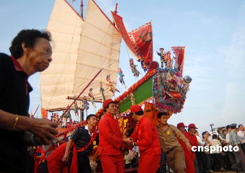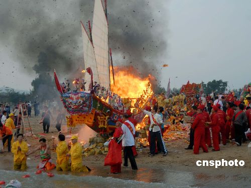 | 11月19日,王船在海邊被祭拜后焚燒。廈門(mén)港歷屆規(guī)模最大的“送王船”盛典在兩岸同胞共同推動(dòng)下,轟轟烈烈地再次呈現(xiàn)。此盛典由從臺(tái)灣回廈門(mén)老家的阮過(guò)水老人主持。經(jīng)過(guò)5天祭祀活動(dòng)后,一艘長(zhǎng)7.36米,真材實(shí)料精工細(xì)作的特制木船“王船”沿廈門(mén)市大學(xué)路、海洋三所等被送到曾厝垵圣媽宮旁海邊化火焚燒,廈門(mén)港漁民借以祈求平安富裕。“送王船”,也稱(chēng)“送王”、“燒王船”,廈門(mén)俗稱(chēng)“做好事”,是流行閩臺(tái)漁港漁村的民間習(xí)俗,意在祈求風(fēng)調(diào)雨順,國(guó)泰民安。廈門(mén)的 “送王船”習(xí)俗,2006年初被公布為福建省級(jí)非物質(zhì)文化遺產(chǎn)。廈門(mén)港 “送王船”均由龍珠殿舉辦,每逢農(nóng)歷閏年進(jìn)行。1995年恢復(fù)中斷多年的這項(xiàng)習(xí)俗后,今年是第五屆。除首屆用紙糊船外,其他都是木船。據(jù)說(shuō),以特制木船在陸地上“送王船”,是公認(rèn)的最高形式。中新社發(fā) 楊戈 攝