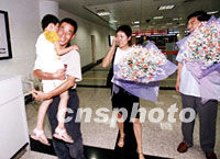 圖:虎口逃生的王勝利在廈門與妻女團(tuán)聚 2001年8月25日 18:42 ![]() 24日上午,在菲律賓南部脫險(xiǎn)的中國公民王勝利乘班機(jī)離開馬尼拉,于上午11時(shí)抵達(dá)廈門國際機(jī)場與妻女相聚。中新社圖 鄭憲 徐萬 攝