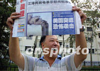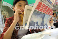 組圖:北京市民關注美國“爆炸事件” 2001年09月12日 10:25 ![]() 十一日發生的美國受襲“爆炸事件”引起了北京媒體的全面關注,十二日清晨報攤攤主高舉報紙頭版向路人吆喝。中新社記者 鄭萍萍 攝 ![]() 十二日清晨,在路邊吃早餐的北京市民關注當日報紙所載美國“爆炸事件”。中新社記者 鄭萍萍 攝