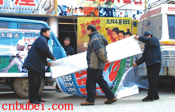 昨天,新洲區文化主管部門獲悉此事后,立即勒令該劇禁演。該區文體局副局長董惠明稱,如此的演出宣傳,是對國人的侮辱,也帶淫穢性質,且演出未辦理任何手續,必須堅決取締。他布置立即拆除并銷毀宣傳畫(如上圖),拆除舞臺布景,暫扣劇組演出物資,等待進一步調查。