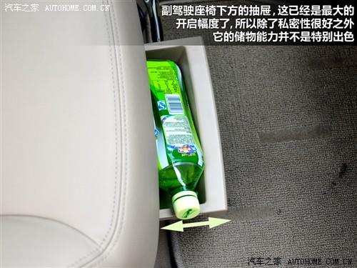 前排副駕駛方面,手套箱內的空間不算大,而且手套箱的下降也沒有阻尼,人性化設計方面只有一個筆架。有不少人喜歡座椅下面的抽屜,但實際內部的空間并不大,而且開口也很小,所以實用程度并不如想象中高。
