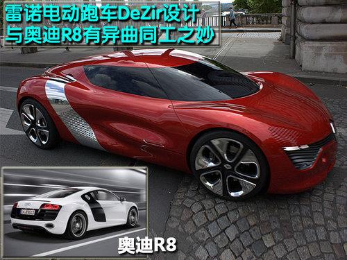 雷諾DeZir車身設計一看就是超跑“范”,外形酷似奧迪的超跑RB,尤其是車身側后的設計,有異曲同工之妙。DeZir車身低矮,前部與尾部的流線平直圓滑,讓它具有不錯的沖擊感,同時車身兩側沒有任何凸出部件,也進一步降低了其風阻系數,使之達到了0.25的不錯水平。