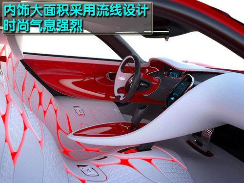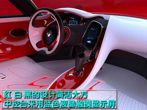 在內飾部分,雷諾DeZir使用了紅與白作為主基調在配上黑色,方向盤、儀表盤、中控臺與換檔手柄都很有概念車的感覺,一體式的白色皮革座椅與中控臺,同樣延承了外形中“波浪”的元素,非常夢幻。