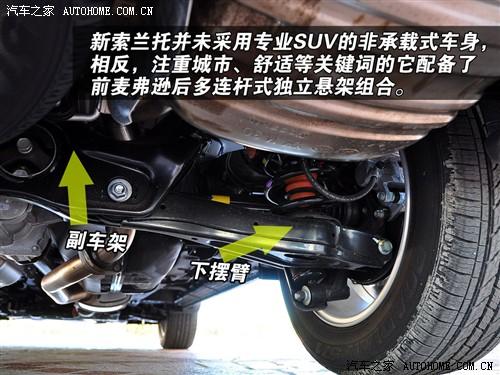 索蘭托懸掛舒適性傾向較強,使用承載式車身和多連桿后懸掛結構,充分體現了城市路況的駕駛需要,不過下擺臂不算單薄,進行簡單的穿越可以應付,但是排氣管的位置偏低,所以應該格外小心,謹防托底。