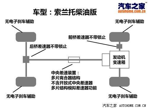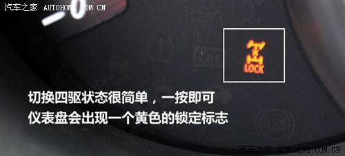 按動中控臺上的四驅按鍵即可切換至四驅模式,索蘭托采用中央多片離合器的四驅結構,前后橋差速器均不帶有鎖止功能,并且沒有電子制動輔助,因此想通過交叉軸是不可能的,所以在進行淺度越野時應該優化路線避免出現交叉軸的情況。