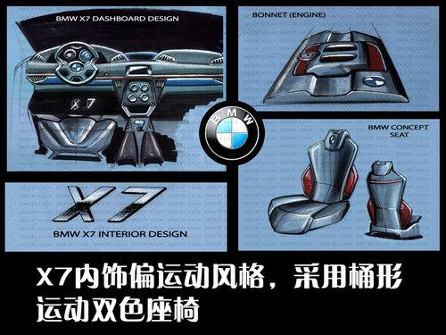 從寶馬X7的內飾草圖可以看出偏向運動風格,有棱有角的中控臺和不規則的方向盤彰顯其與眾不同。桶形賽車座椅極富現代感,腰部兩側支撐與座椅主體采用不同色的搭配。