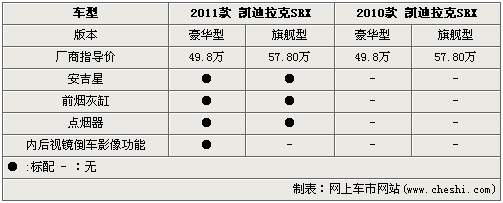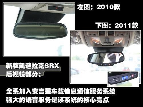 根據4S店人員介紹,2011款凱迪拉克主要的變化是發生在配置的部分。凱迪拉克全系2011款車型加入了前排點煙器和煙灰缸,最主要的配置是搭載有安吉星(OnStar)車載信息通信服務系統,而2011款豪華版SRX還把內后視鏡倒車影像更能列入其中。價格方面2011款凱迪拉克SRX與老款相比沒有發生任何變化。