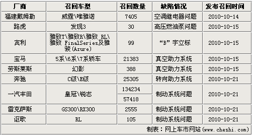 從上面的統(tǒng)計表可以看出,從10月14日開始召回公告頻頻發(fā)布,僅15日一天就有4個品牌實施召回,而它們還是市場中的豪華品牌甚至超豪華品牌如勞斯萊斯、賓利,奔馳、寶馬也沒有落后分別召回其主力車款寶馬5系、7系和C級、E級。曾備受關(guān)注的豐田品牌再次實施召回,這次是皇冠和銳志總召回接近20萬輛。而在召回原因中,制動系統(tǒng)問題占了很大的比重,這點有點令消費者擔心。