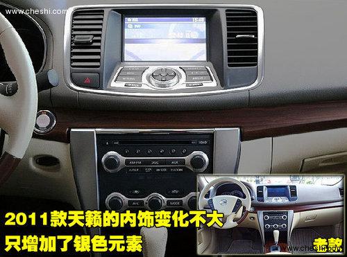 在內飾方面,新天籟的中控臺與老款相比沒有明顯變化,按鍵錯落分明,布局合理。大尺寸液晶顯示屏幕放置在正中間,集合了NAVI衛星導航、DVD及倒車影像功能?刂婆_做工精致,人性化的角度讓你不需低頭便可操作。三個圓形自發光儀表盤,簡潔大方、清晰易讀。
